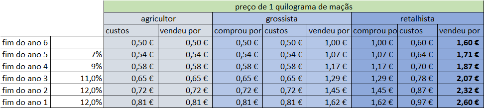 O nosso agricultor vendeu então a sua produção a um grossista e este acrescentou a esse preço, o transporte e armazenamento das maçãs mais os impostos pagos na compra e ainda uma margem de lucro para obter meios de investimento, pagamento de salários e seguros. No final, coloca as maçãs à venda por 1 eur por cada quilograma.